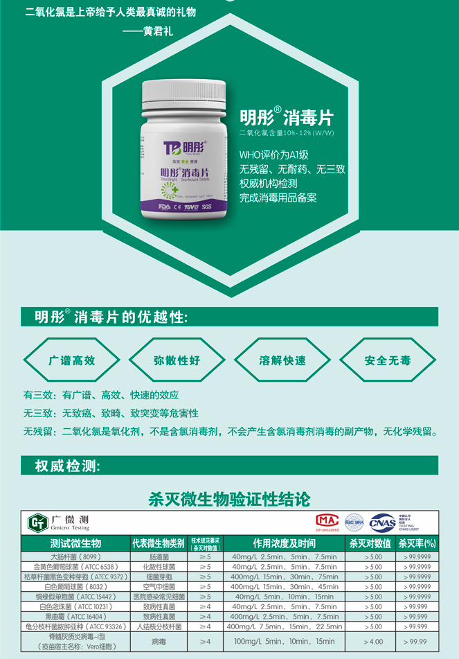 明彤消毒片,其核心成分是二氧化氯(含量:10-12%(w/w))。二氧化氯是一種高效安全的消毒劑,被WHO評(píng)價(jià)為A1級(jí)。權(quán)威檢測(cè)顯示,明彤消毒片對(duì)大腸桿菌等致病微生物的清除率高達(dá)99.9999%。