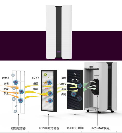 高效濾網、紫外線、B-COST專利觸媒消毒模塊,分體安裝,靈活布局,可以持續為室內輸入經過凈化消毒的空氣。