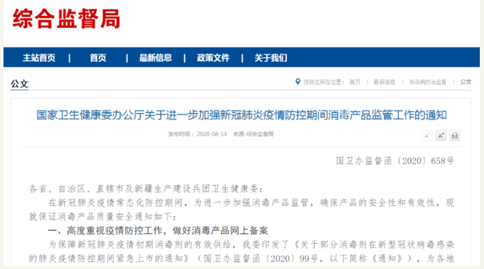 2020年08月13日,國家衛生健康委辦公廳發布了《關于進一步加強新冠肺炎疫情防控期間消毒產品監管工作的通知》(以下簡稱《通知》)。
